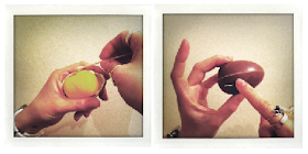 As the chocolate cools down and hardens quite quickly, the best thing to do is use the toothpick to put a few blobs around the whole of the egg rim. Try not to make the blobs...too blobby... as a little will come out of the seams when placed together. This will happen a little when you match the two halves together, but using your finger, smooth around the edges and they will disappear and your egg will be sealed!